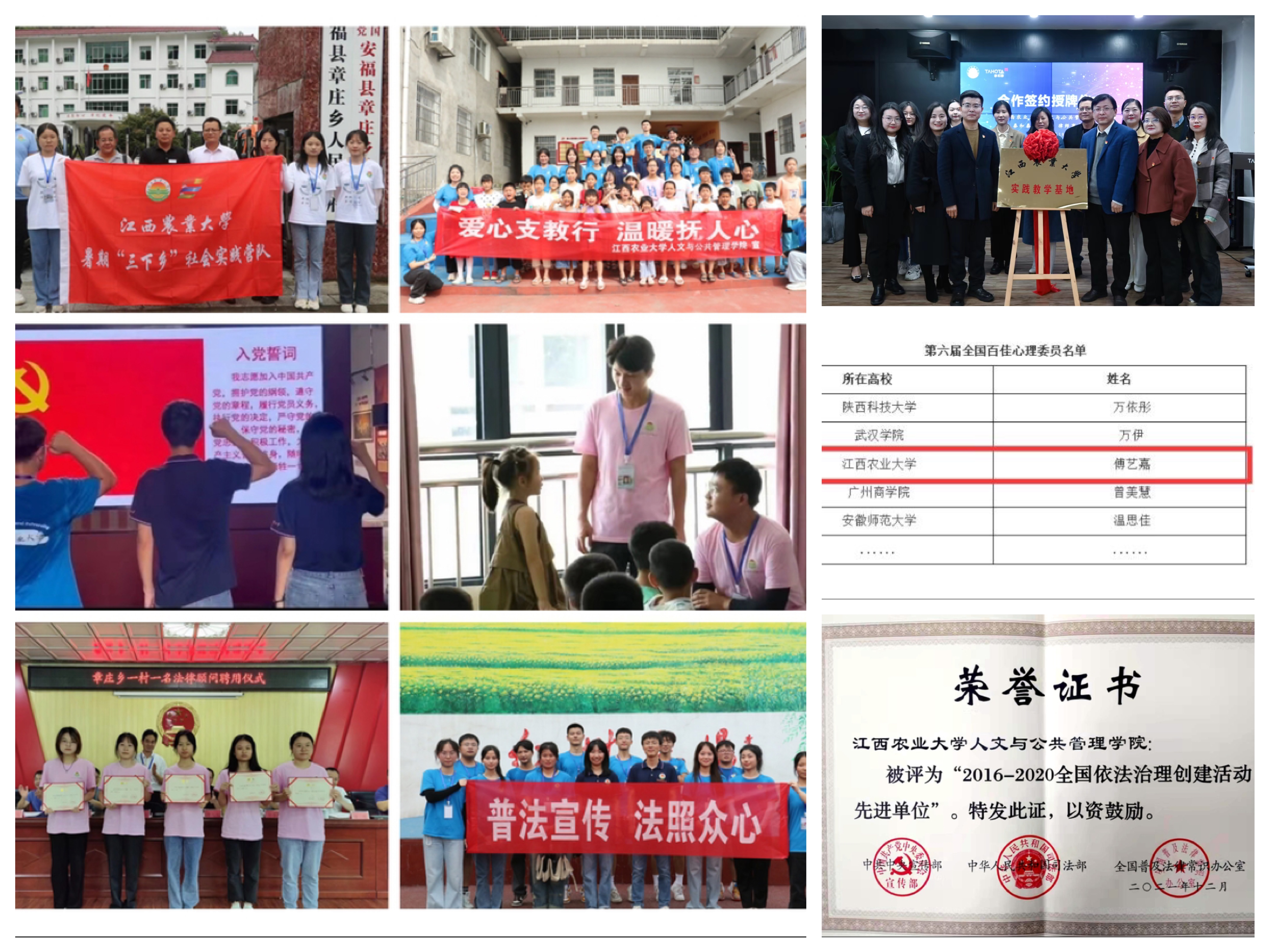 公司重视实践育人,坚持教学同社会实践相结合,坚持教育同服务社会相结合,全面培养德智体美劳“五育并举”的社会主义事业的合格建设者和可靠接班人。大力开展实践教学,在江西日报社、经开十中、经开区法院、泰和泰律师事务所等单位建立实践基地,常态化开展富有成效的教学实习实践活动。每年组织员工开展普法宣传、推广普通话、乡村调查、支教服务、助老助残、关爱留守儿童等社会服务活动,持续开展的“一村一名法律顾问”“法律明白人”培育工程,获评全国大中专员工志愿者暑期“三下乡”社会实践“千校千项”成果“最具影响好项目”、江西省老员工普法联盟宪法宣传教育实践评比活动“一等奖”,被人民网、中国法制周刊等权威媒体多次报道,取得良好社会反响。公司先后获评“全国依法治理创建活动先进单位”、“全国暑期三下乡社会实践活动优秀团队”、“第二届江西省青年志愿服务项目银奖”等荣誉,一批师生获评“全国百佳心理委员”、“全省暑期社会实践先进个人”、“全省优秀志愿者”等荣誉称号。公司连续3年获得公司党团知识竞赛一等奖,老员工志愿协会团支部获评“全国五四红旗团支部”。