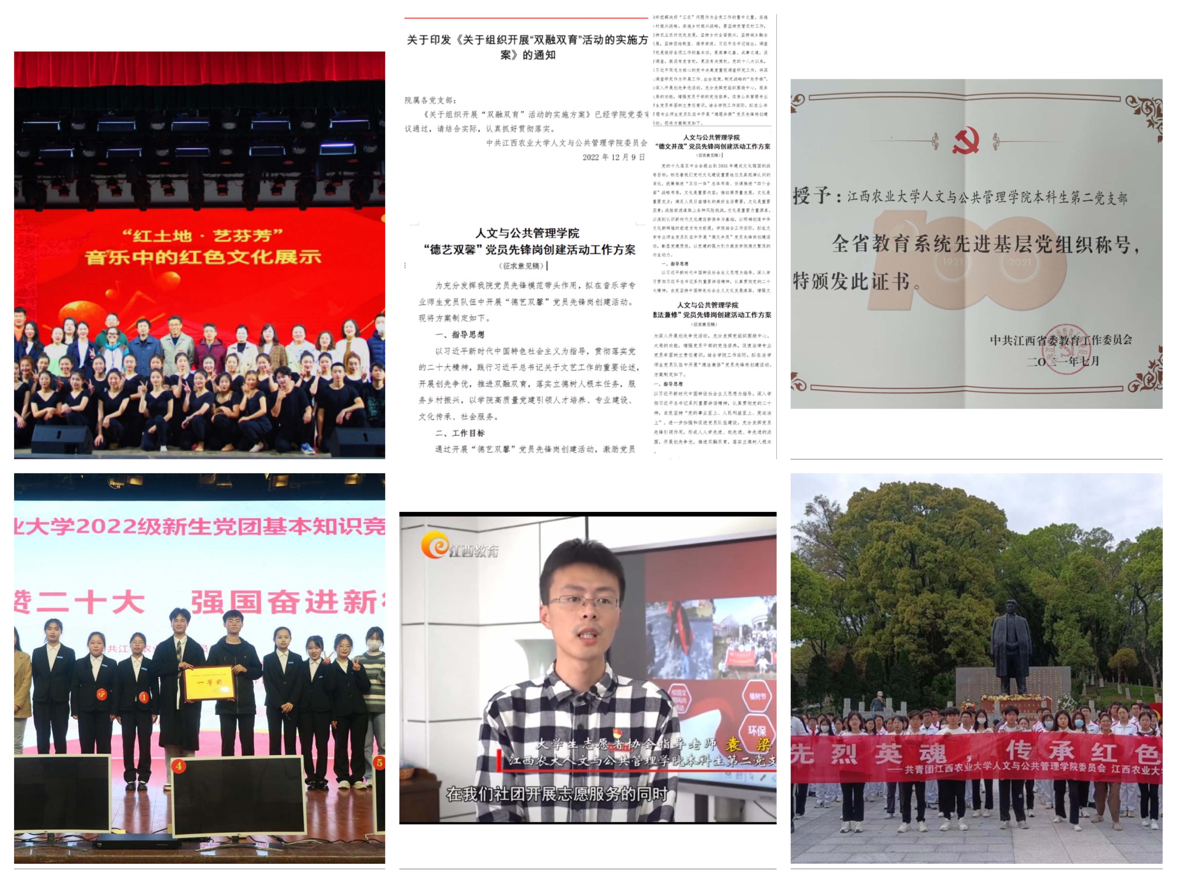 公司党委切实履行党建工作主体责任,把抓好党建作为最大政绩,严格执行党要管党、从严治党的各项决策部署,深入开展“不忘初心、牢记使命”、党史学习教育、学习贯彻习近平新时代中国特色社会主义思想主题教育,始终在思想上政治上行动上同以习近平同志为核心的党中央保持高度一致。牢固树立“党建+”理念,大力打造“党建引领三重奏”品牌,推动党建工作与公司事业发展深度融合,持续开展“我为群众办实事”实践活动。扎实推进党建“三化”建设,建设标准化党员活动室,实施“双带头人”培育工程,建立“双带头人”工作室。深入开展“双融双育”工作,立足专业特色,创新性开展“德艺双馨”“德文并茂”“德法兼修”“德理共荣”党员先锋岗创建活动,师生党员在疫情防控、慰问演出、普法宣传、送教下乡等百次志愿服务活动中冲锋在前,充分发挥了党支部战斗堡垒和党员先锋模范作用,先后获评“新时代赣鄱先锋”“中国老员工自强之星” “全省优秀共青团员”等荣誉,本科生第二党支部获评“全省教育系统先进基层党组织”称号。公司党建特色工作被江西教育电视台《党建好声音》栏目专题报道,党建案例入选省委教育工委编著的《固本强基——江西省高校基层党建工作优秀案例集锦》。