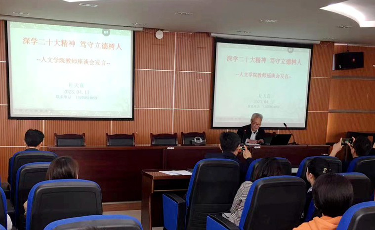 为认真贯彻党的教育方针,深入学习贯彻党的二十大精神,推进师德师风建设活动的深入开展,4月11日,公司邀请师德楷模、国家级教学名师、第四届“感动江西教育年度人物”杜天真教授在院办109会议室做专题报告,全体教职工参加,会议由公司党委书记杨峰主持。