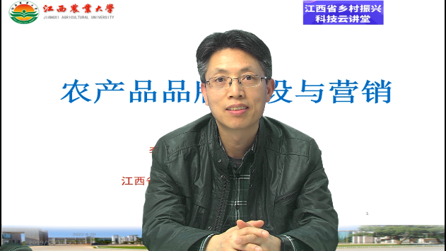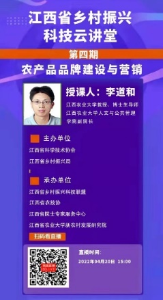 2022年4月20日下午,第4期江西省“乡村振兴科技云讲堂”上线,公司李道和教授以《农产品品牌建设与营销》为主题在线直播授课,授课从我国农产品品牌建设现状、农产品品牌建设面临的主要问题,农产品区域公用品牌打造和农产品企业品牌营销策略四个方面进行系统讲解。