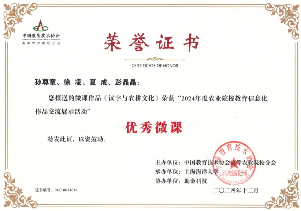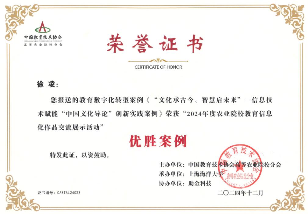 12月29日,中国教育技术协会高等农业院校分会公布了2024年高等农业院校教育信息化作品交流展示评选结果,徐凌老师设计的“‘文化承古今、智慧启未来’——信息技术赋能‘中国文化导论’创新实践案例”和孙尊章老师主讲的“汉字与农耕文化”微课视频(团队成员:徐凌、夏成、彭晶晶),分别荣获2024年高等农业院校教育信息化作品交流展示评选活动“教育数字化转型优胜案例”和“优秀微课作品”。此次展示活动由中国教育技术协会高等农业院校分会主办,旨在贯彻落实国家数字中国建设和教育数字化战略行动部署,加快推进农业高校教育数字化转型和智能化升级,促进信息技术与公司产品融合创新。这两项获奖,是公司教育信息化成果的体现。