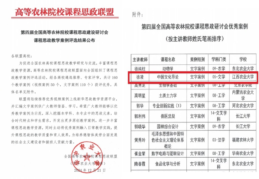 近日,由高等农林院校课程思政联盟主办的第四届全国高等农林院校课程思政建设研讨会,评选出了全国高等农林院校课程思政优秀案例。徐凌老师精心设计的“‘汉字承华夏、文化育国魂’——汉字与文化”教学案例在全国780份优秀案例中崭露头角,荣获课程思政教学优秀案例殊荣。据悉,联盟面向全国广泛征集课程思政教学案例,经过各高校的精心遴选与专家的严格评审,最终评选出160个优秀教学案例,其中包括50个视频案例和110个文字案例。这些优秀案例将在新华思政网平台上线展示,此次获奖将提升了公司课程思政建设的社会影响力和美誉度。