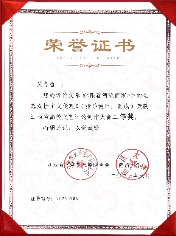 6月19日,江西省高校文艺评论创作大赛颁奖典礼在南昌大学举行。公司中文系员工吴冬哲的论文《〈跟着河流回家〉中的生态女性主义伦理》(指导教师夏成)荣获大赛二等奖。