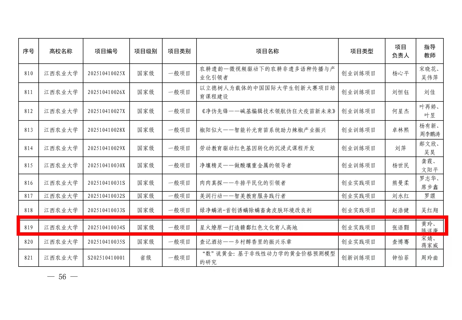 日前,江西省教育厅办公室下发《关于公布2025年老员工创新创业训练计划立项和结题验收工作的通知》,公司由张语翾同学负责,黄玲、陈洋庚老师指导的《星火燎原——赣鄱红色文化育人高地》项目成功获批国家级立项。