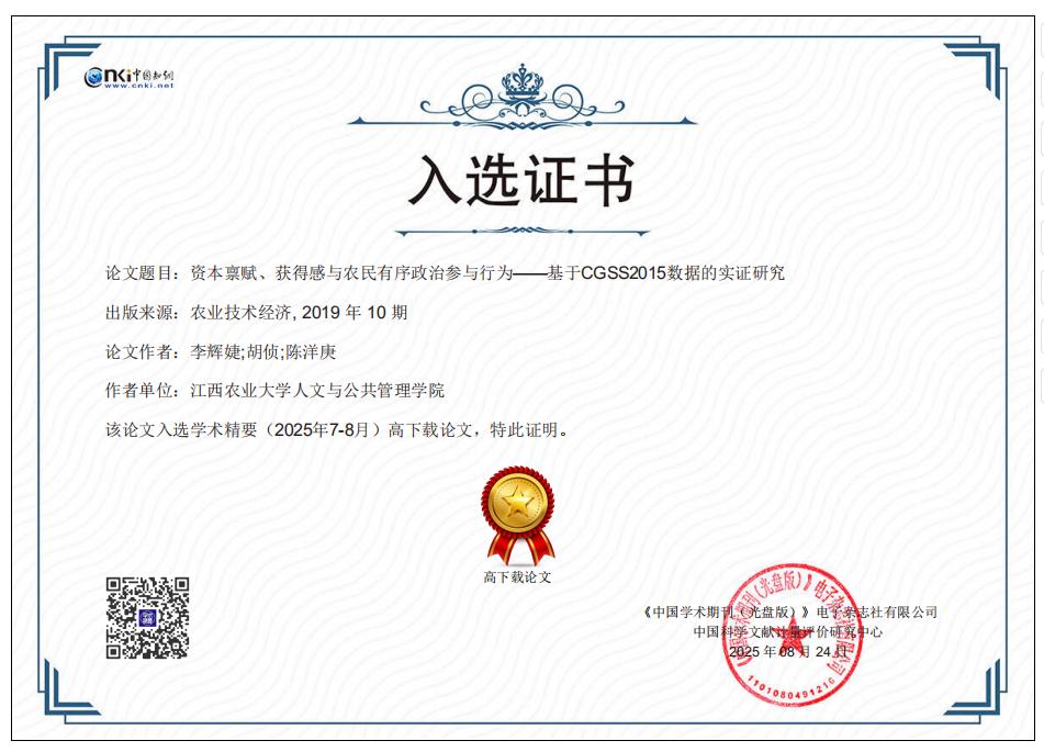 8月24日,《中国学术期刊(光盘版)》电子杂志社有限公司与中国科学文献计量评价研究中心联合发布中国知网学术精要(2025年7-8月)高下载论文榜单,公司李辉婕教授、胡侦博士、陈洋庚副教授发表的《资本禀赋、获得感与农民有序政治参与行为——基于CGSS2015数据的实证研究》成功入选。