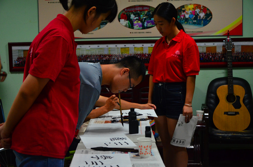 书法课堂教学主要是学习软笔书法的基本书法笔画。志愿者在书法课堂上对软笔书法的基本运笔与写法进行了细致的讲解和示范。除此之外,志愿者还和口书书法家何子龙老师进行了书法交流,何老师以口书的方式在宣纸上写下一个个苍劲有力的汉字。让志愿者感受着残障人士的坚强。