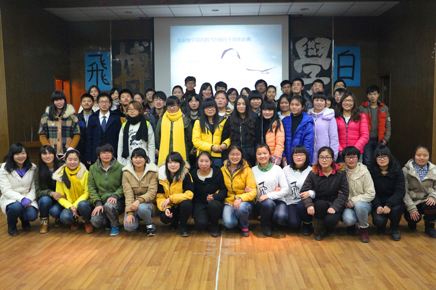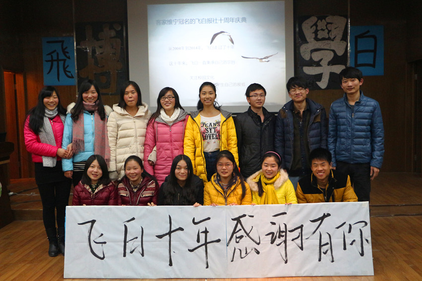 从2004到2014,飞白秉着“铁肩担道义,妙手著文章”的理念,以“关注校园文化,做老员工自己的报纸”为宗旨,历经了十年。十年间,飞白从校明星社团到国家优秀社团,每一代飞白人都在付出中收获着骄傲,在合作中收获着感动。
