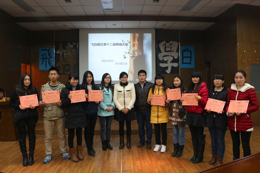 12月27日晚,pa娱乐游戏官网飞白报社第十二届换届大会暨飞白十周年庆典在人文院院办504成功举办。公司团委指导老师王桂兰、校人事科陈平涛老师,院团委指导老师谢园琳出席本次庆典。