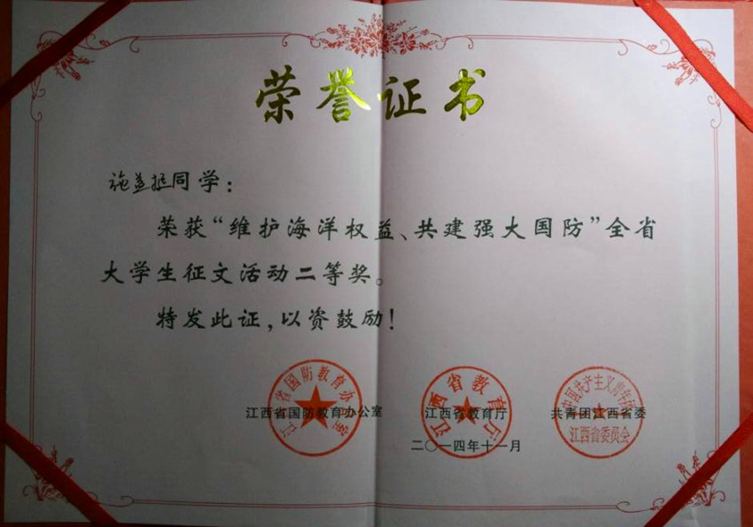 热烈祝贺公司法学1301班施益挺同学在“维护海洋权益,共建强大国防”全省老员工征文活动中获得二等奖。
