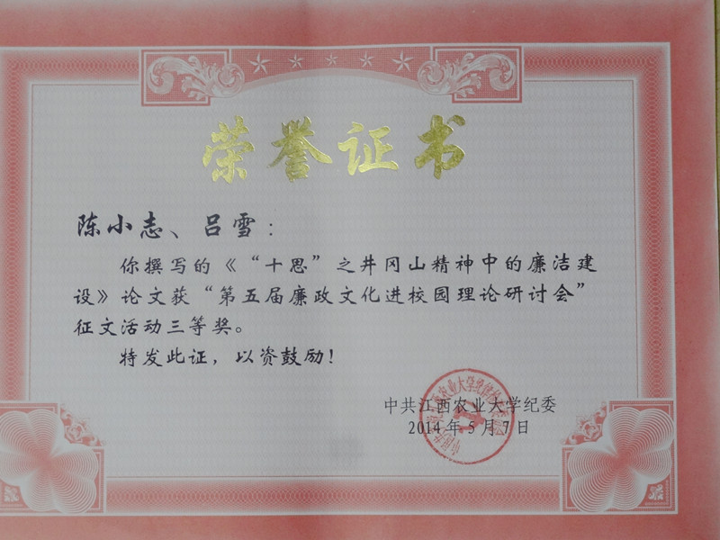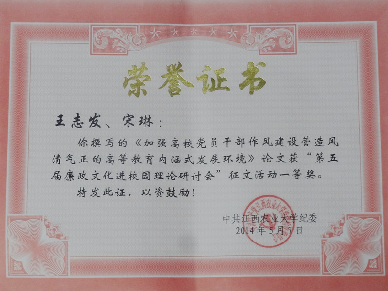 近日,根据学校《关于举办“中国梦·廉洁情”系列主题教育活动的通知》的部署,经各单位的精心组织,第五届廉政文化进校园理论研讨会征文活动顺利完成,经专家盲审,评选出获奖优秀论文20篇(一等奖4篇、二等奖8篇、三等奖8篇)。其中,公司党委副书记王志发和团委老师宋琳撰写的《加强高公司党员干部作风建设 营造风清气正的高等教育内涵式发展环境》、王志发副书记和张永臣同学撰写的《依托红色文化资源 推进廉政伦理建设》两篇论文均荣获本次比赛一等奖。