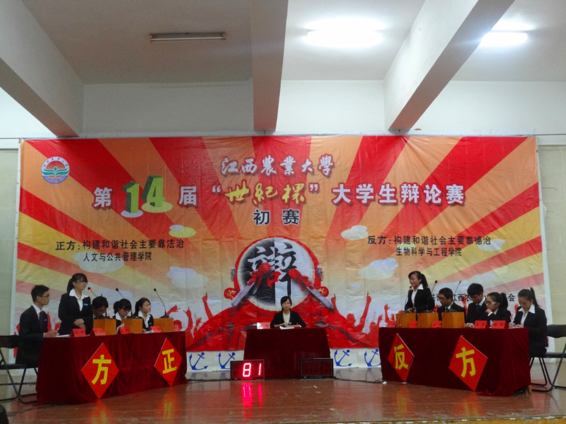 11月18日,第十四届“世纪杯”辩论赛第八场在老员工活动中心501顺利举行。公司(正方)与生工院(反方)围绕“构建和谐社会主要靠法制还是德治”辩题展开激烈辩论。校纪委综合办公室主任胡永华、校团委副书记郭军海、马克思主义政治公司罗忆芳、傅琼老师和第十三届世纪杯优秀辩手何芮担任本场比赛评委。