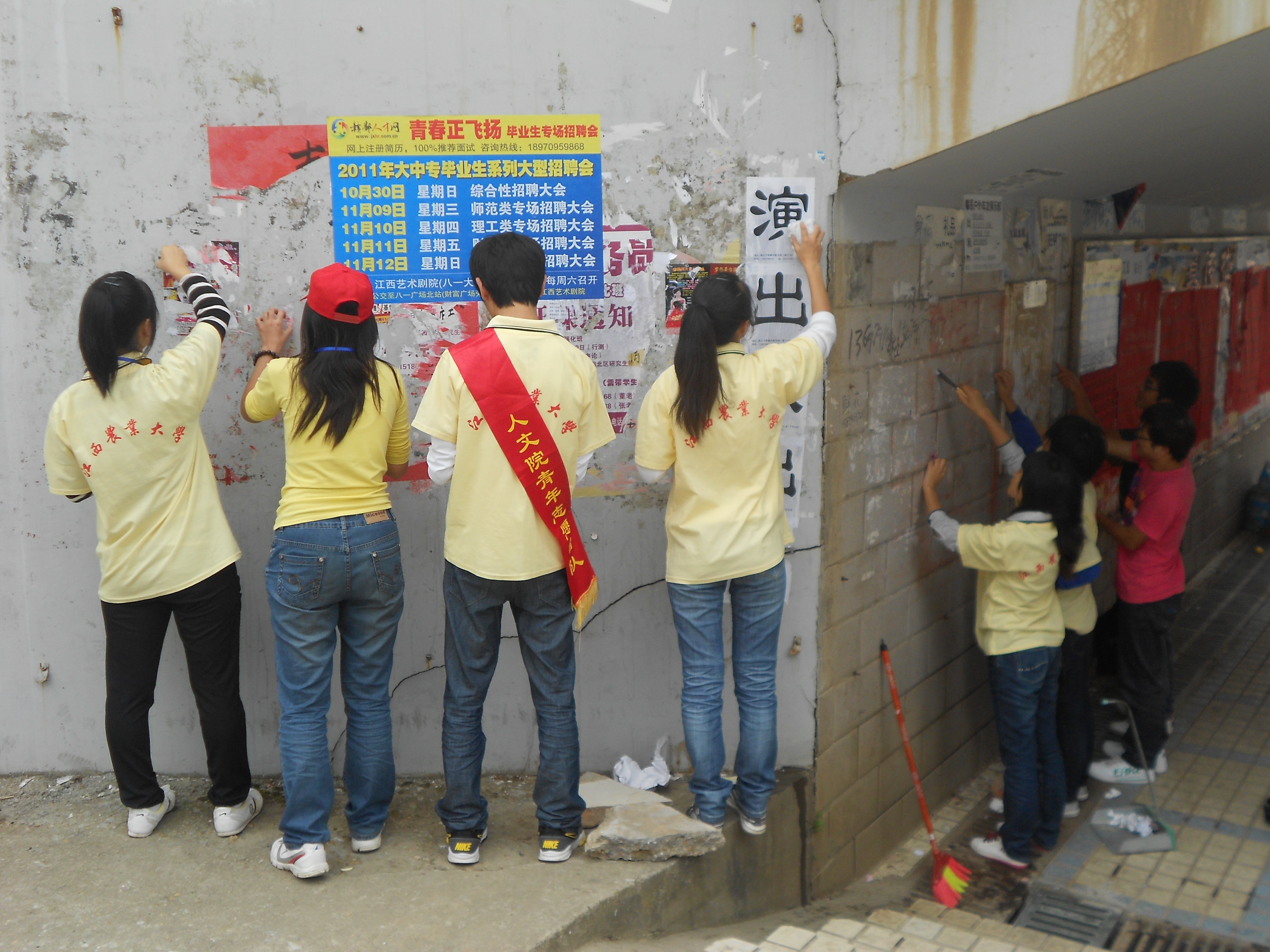 11月6日,公司青年志愿者深入校园角落,开展清除“牛皮癣”及清扫校园死角垃圾活动。志愿者们对地下通道违规张贴的广告及翠湖边上的垃圾进行了清理,使校园周边环境焕然一新。