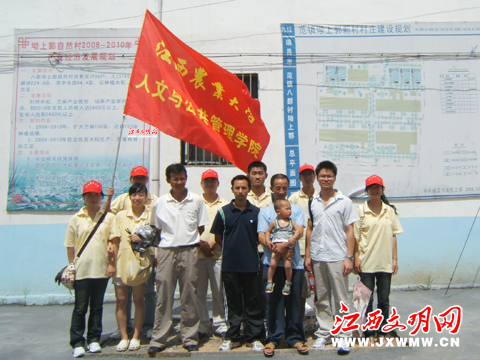 在八都村所辖的自然村坳上郭,实践队员们对当地村民进行了新农村建设与法律意识的调查以及法律知识的宣传。据八都村村长介绍,坳上郭在06年“12•6九江地震”后是灾民安置点,因为该区域的基础相对较好,经过迁移来村民1年多的建设,08年已成为省级新农村建设示范点。在与村民的交流中队员们发现,当地村民对他们如今的生活条件与环境现状相对满意。