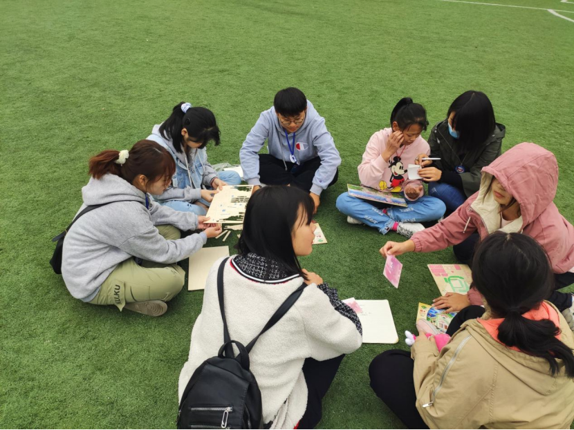 图为志愿者和孩子们拼图折纸