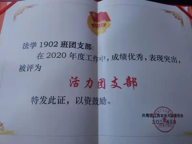 青年团员队伍充分发挥模范带头作用,给公司带来了诸多荣誉。2018年,公司两支志愿者分队荣获“江西省大中专员工志愿者暑期文化科技卫生‘三下乡’社会实践活动优秀服务队”称号、暑期社会实践项目荣获2018年全国“千校千项”最具影响好项目荣誉称号;2020年,公司获2020年江西省暑期三下乡社会实践活动优秀实践团队荣誉称号、“一村一名法律顾问”团队荣获江西省“三下乡”社会实践活动优秀服务队称号。