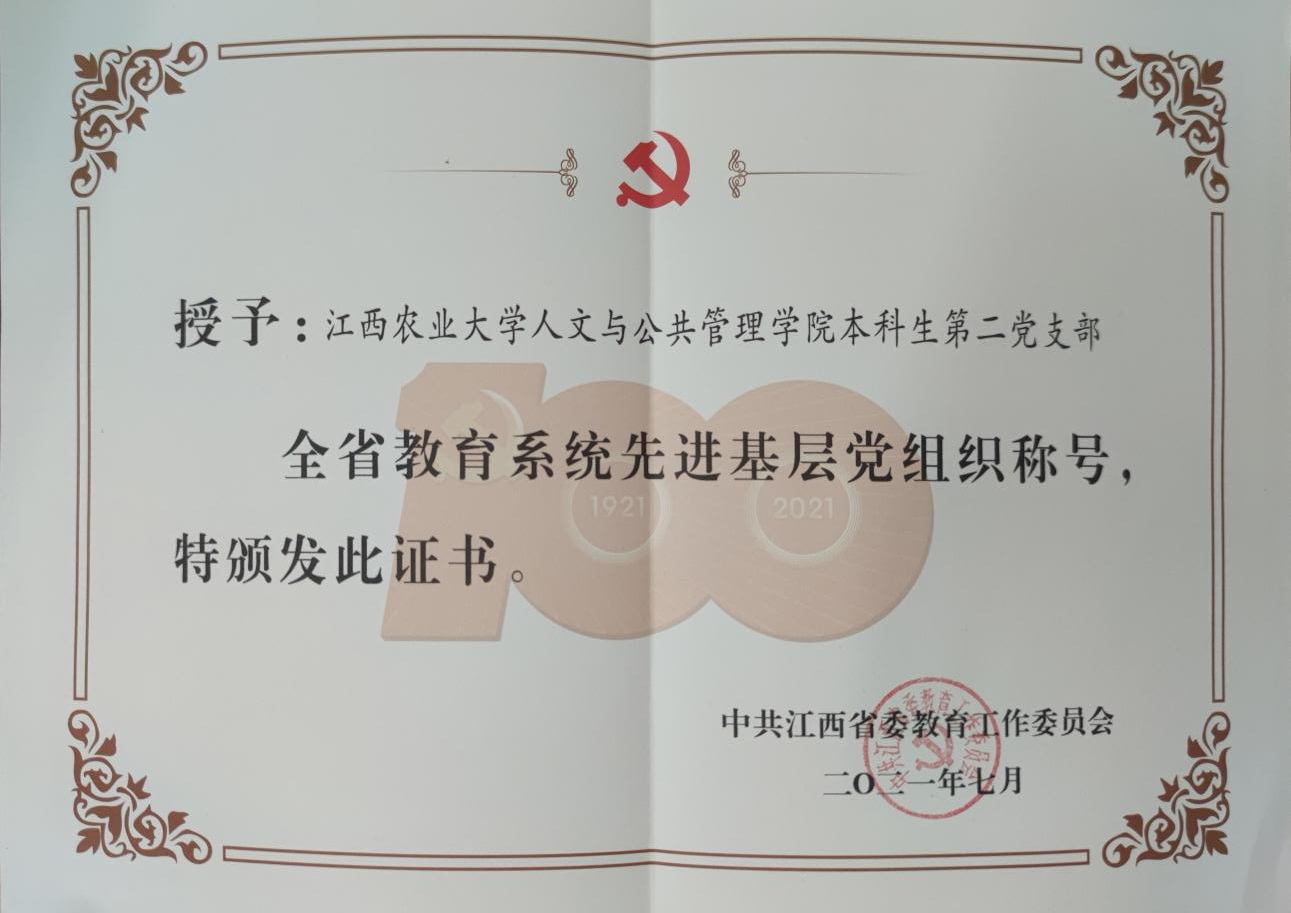 近日从中共江西省委教育工作委员会传来喜讯公司本科生第二党支部在2021年度江西省两优一先”评选中,被评为“全省教育系统先进基层党组织”。