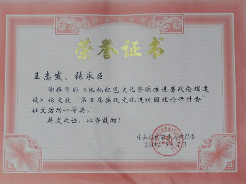 近日,根据学校《关于举办“中国梦·廉洁情”系列主题教育活动的通知》的部署,经各单位的精心组织,第五届廉政文化进校园理论研讨会征文活动顺利完成,经专家盲审,评选出获奖优秀论文20篇(一等奖4篇、二等奖8篇、三等奖8篇)。其中,公司党委副书记王志发和团委老师宋琳撰写的《加强高公司党员干部作风建设 营造风清气正的高等教育内涵式发展环境》、王志发副书记和张永臣同学撰写的《依托红色文化资源 推进廉政伦理建设》两篇论文均荣获本次比赛一等奖。