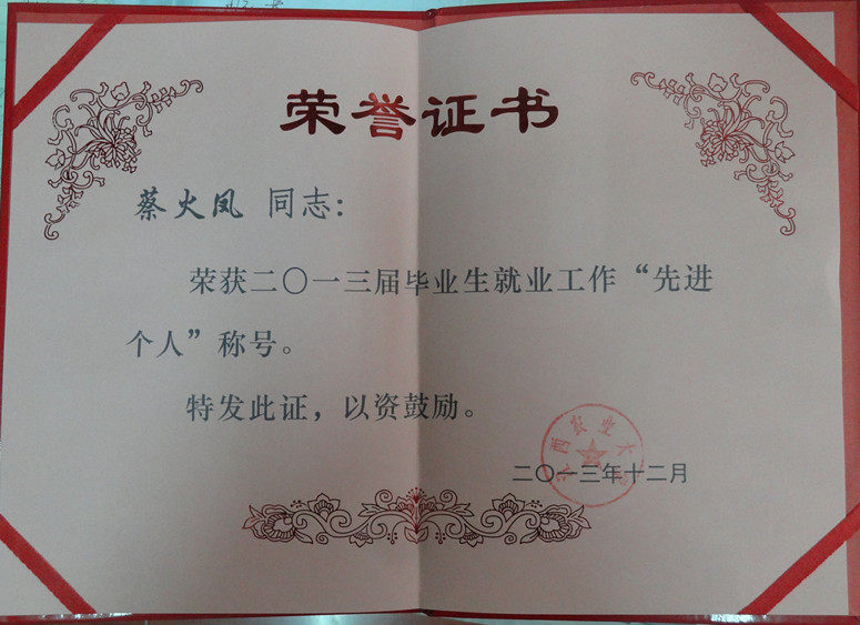 12月4日,从公司2013届毕业生就业工作总结表彰大会上传来喜讯,公司荣获2013届毕业生就业工作“先进集体”(6个公司获此殊荣)荣誉称号,管科091班班主任蔡火凤荣获毕业生就业工作“先进个人”(19人获此殊荣)称号。
