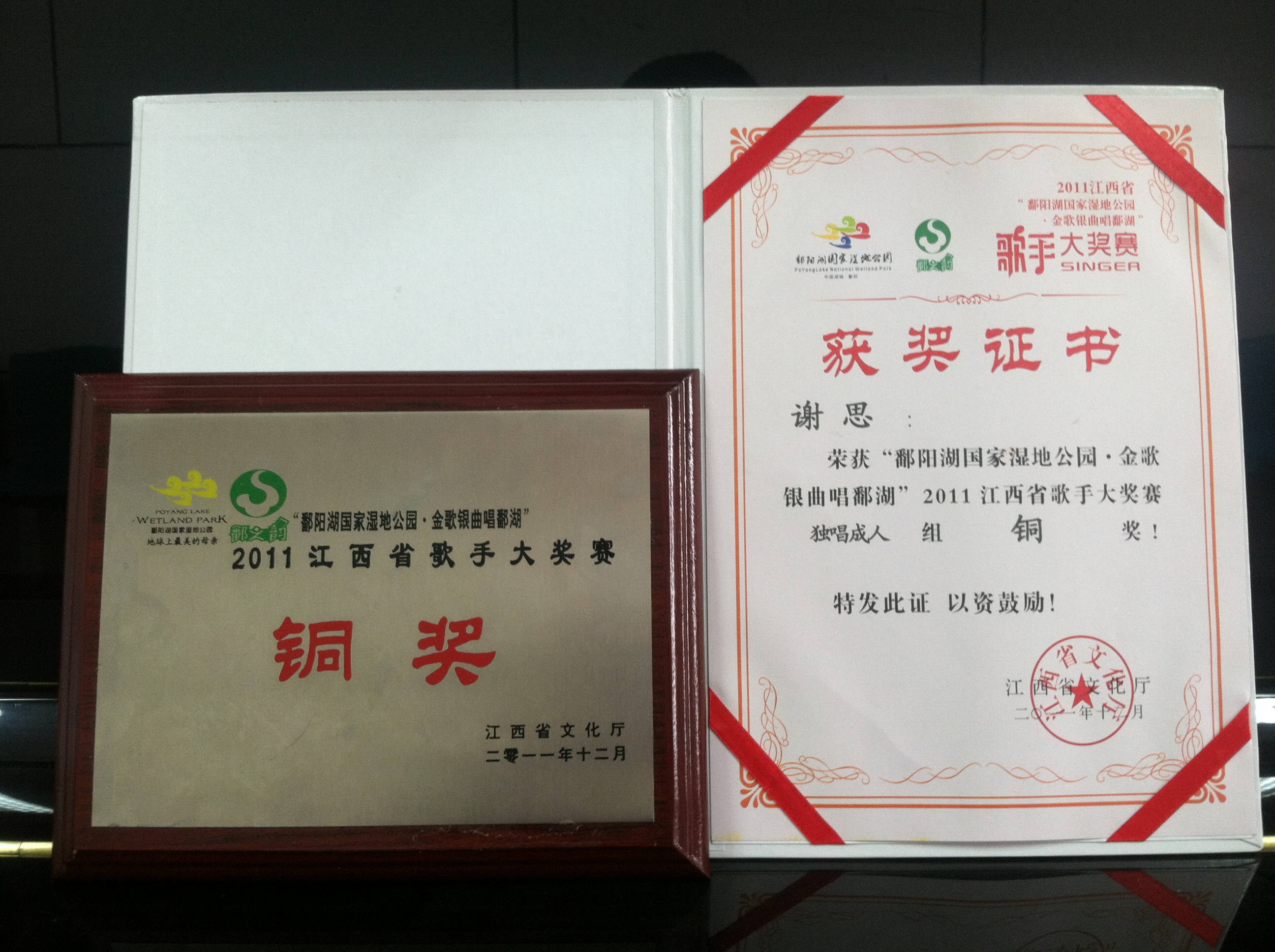 近日,公司音乐表演专业谢思同学在公司程明、陈小志老师的指导下,喜获由江西省文化厅主办、中共鄱阳县委、鄱阳县人民政府承办的“鄱阳湖国家湿地公园·金歌银曲唱鄱湖”2011江西省歌手大奖赛独唱成人组铜奖。(pa娱乐游戏团委)