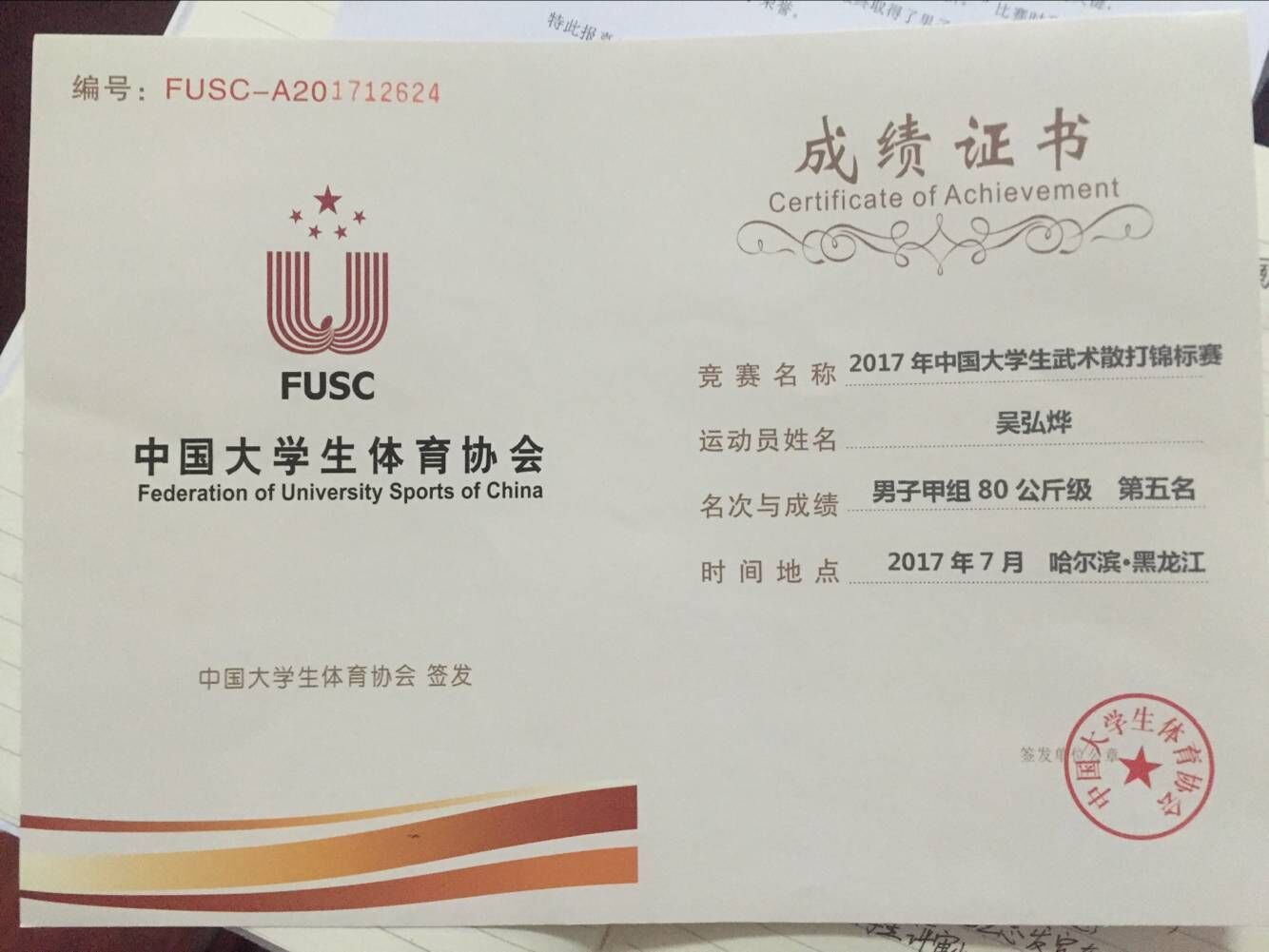 2017年7月13日至20日期间,由中国老员工体育协会主办、黑龙江省体育局承办的2017圣德杯全国老员工武术散打锦标赛在哈尔滨黑龙江大学成功举办。公司公共事业管理1401班的吴弘烨同学参赛,并荣获男子甲组八十公斤级第五名的优异成绩。