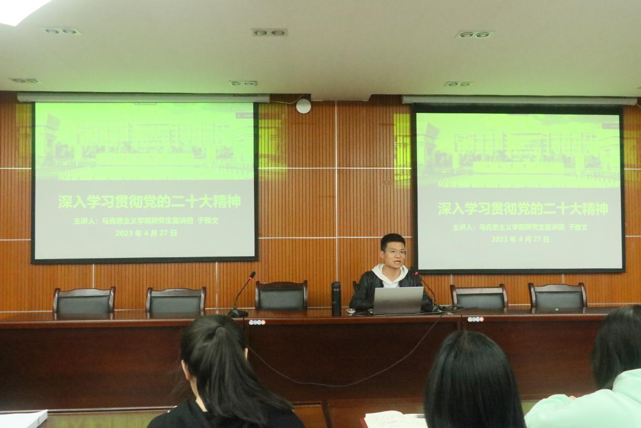 为深入学习贯彻党的二十大精神,扎实推进主题教育,4月27日晚,公司于院办109举行“深入学习贯彻党的二十大精神”宣讲会。宣讲会邀请马克思主义公司习近平新时代中国特色社会主义思想研究生宣讲团成员于雅文担任主讲,公司政治辅导员和全体员工三个员工支部全体党员参加学习。