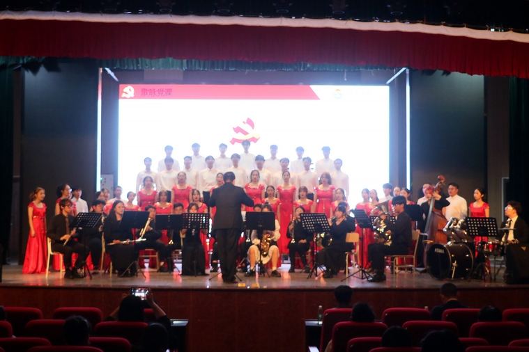 党课伊始,公司党员教师黄玲、杨巍带领音乐系员工登台演出,同学们管乐齐鸣,同声合唱,一首《毛委员和我们在一起》,把现场师生带回到井冈山的峥嵘岁月。