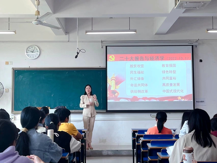 校优秀教师封玫副教授是管理法学教工支部书记,她认真组织支部学习宣讲活动,带头走上讲台宣讲。她在《经济学》课堂上,提炼了“脱贫攻坚”“供给侧改革”“共同富裕”十个关键词,向同学们生动讲述了二十大报告中的主要内容。