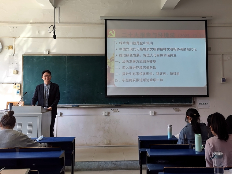 校优秀共产党员、法学系系主任徐瑾副教授走进《环境法学》课堂,他以《二十大报告和环境法学》为主题,向同学讲到:“习近平总书记在二十大报告强调,推动绿色发展,促进人与自然和谐共生。我们要主动做生态文明法制建设的实践者,积极保护生态环境。”