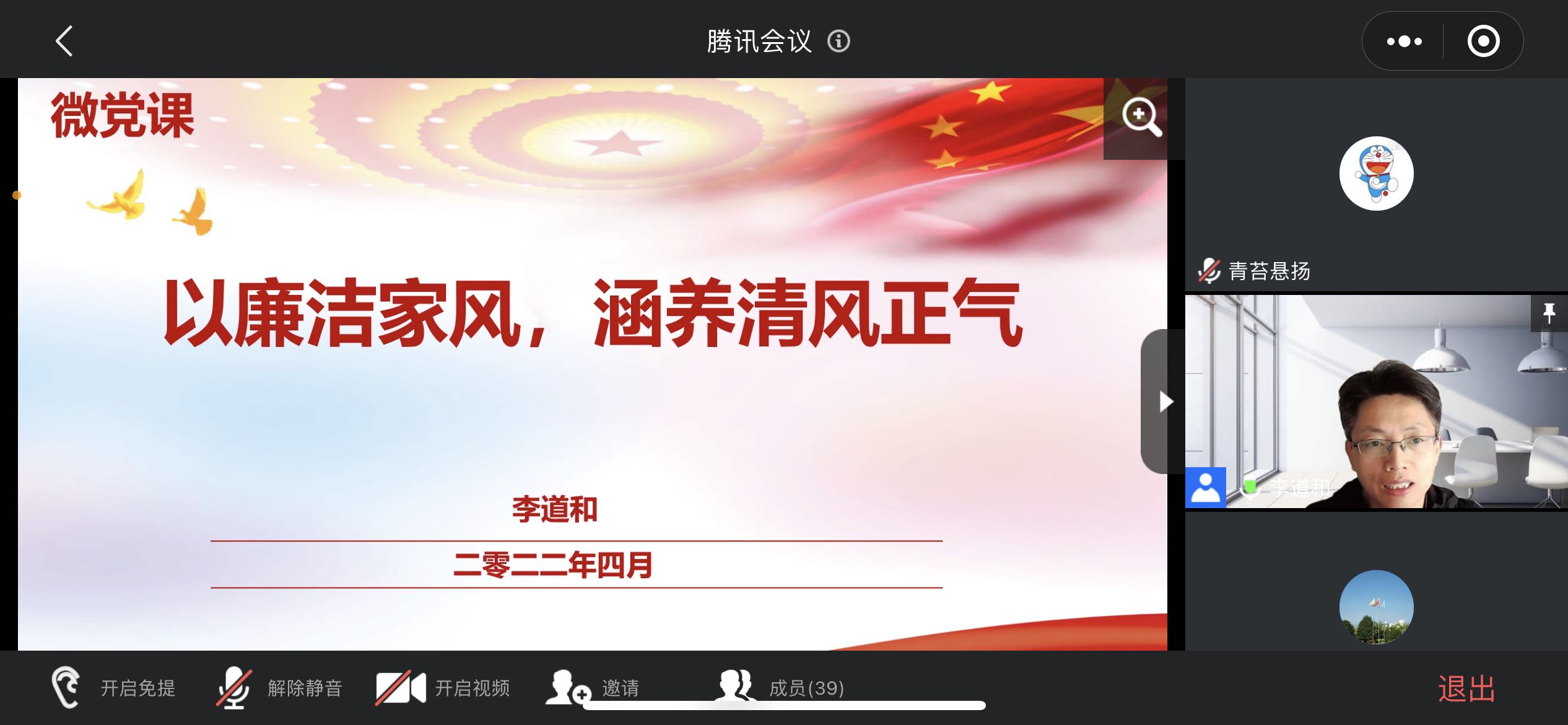 4月12日下午,公司通过腾讯会议APP线上开展党风廉政警示教育暨“廉洁家风”专题学习交流会,公司全体教工党员参加学习。公司党委书记杨峰主持会议。