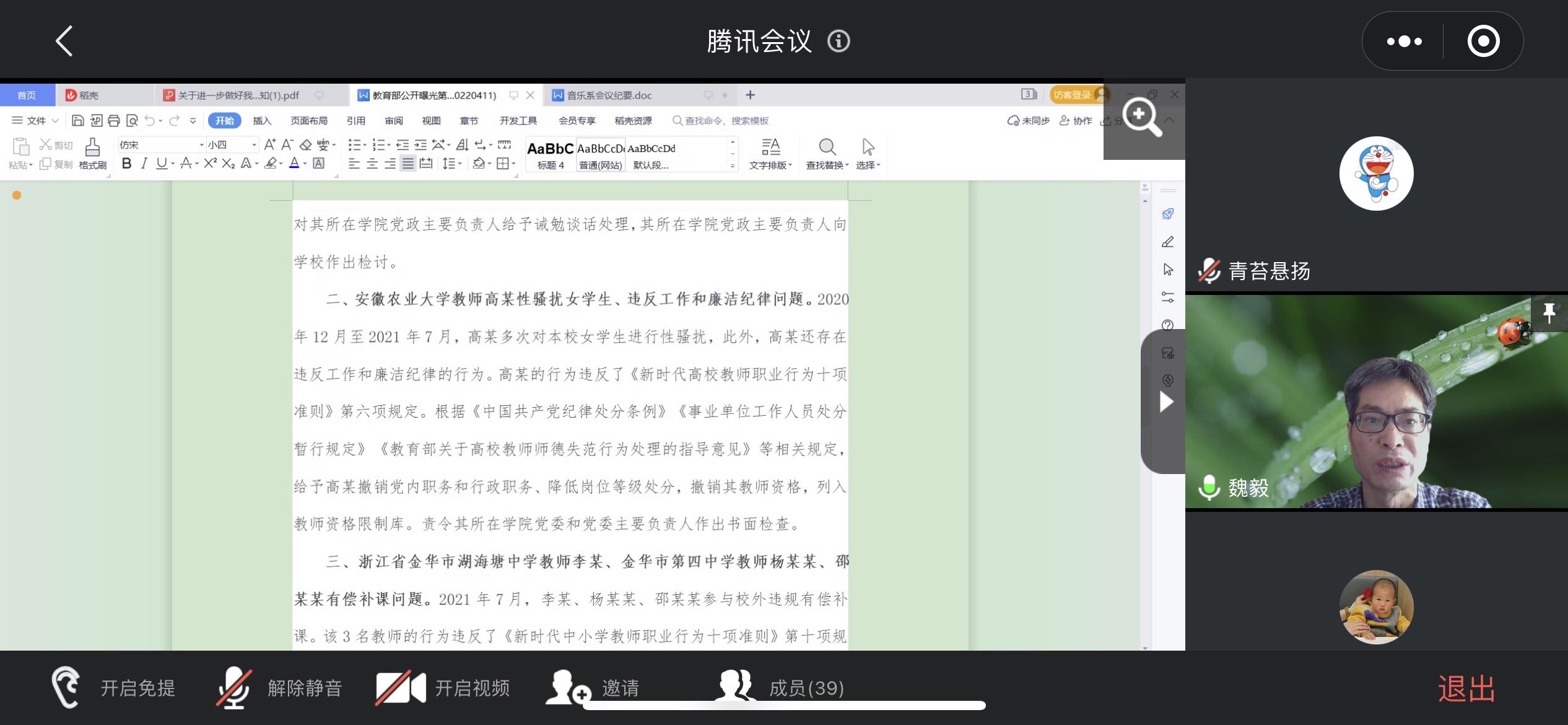 经理魏毅通报了教育部公开曝光第九批7起违反教师职业行为十项准则典型案例,传达了关于教团队格丧失撤销工作的有关文件精神,强调要严把师德师风第一标准,落实立德树人根本任务。